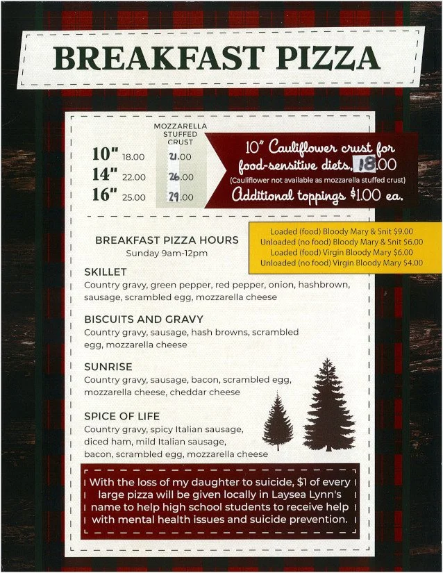 *Breakfast Pizza - October 12th through the weekend before Memorial Day.