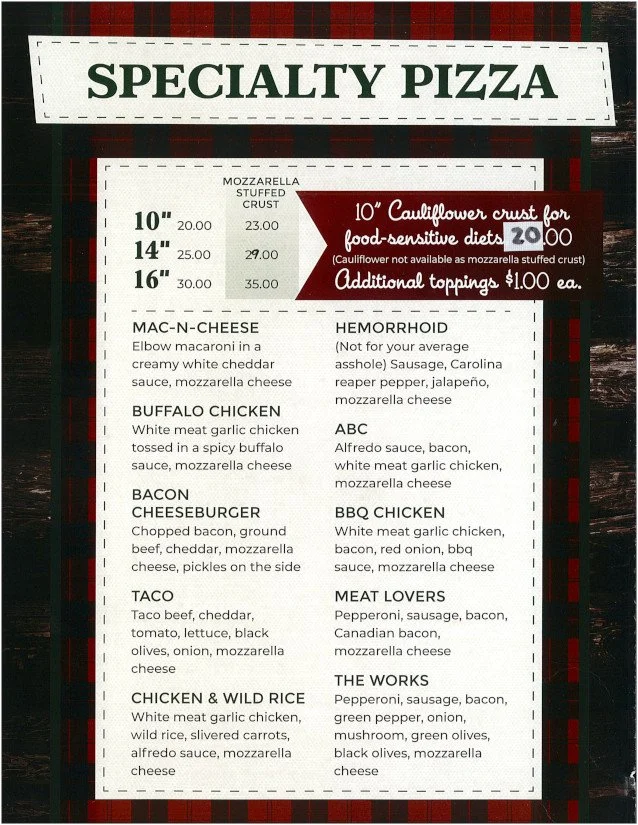What's not to love about Log Cabin Tavern Pizza? Our delicious pizza is made to order. It is hot, scrumptious and succulent all together. Our flavorful pizza will send your taste buds into orbit when you take your first bite. The combination of our sauce, cheese, toppings, crust and seasoning are one of a kind. We offer specialty pizzas along with create your own pizza options, pizza fries and breakfast pizza. Our "Za" is the perfect meal to enjoy and share with friends and family. Cauliflower crust for food sensitive diets available in 10" size.